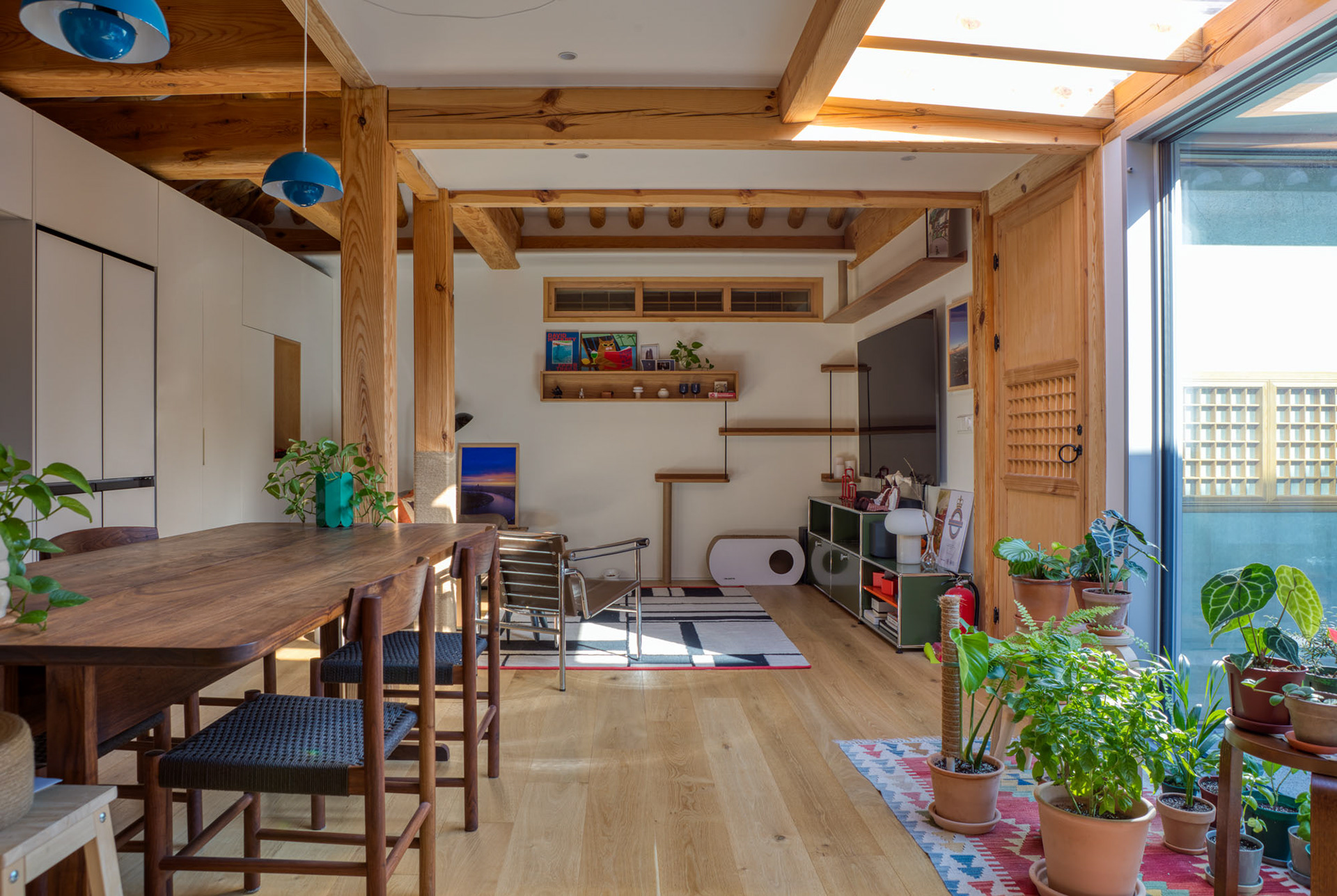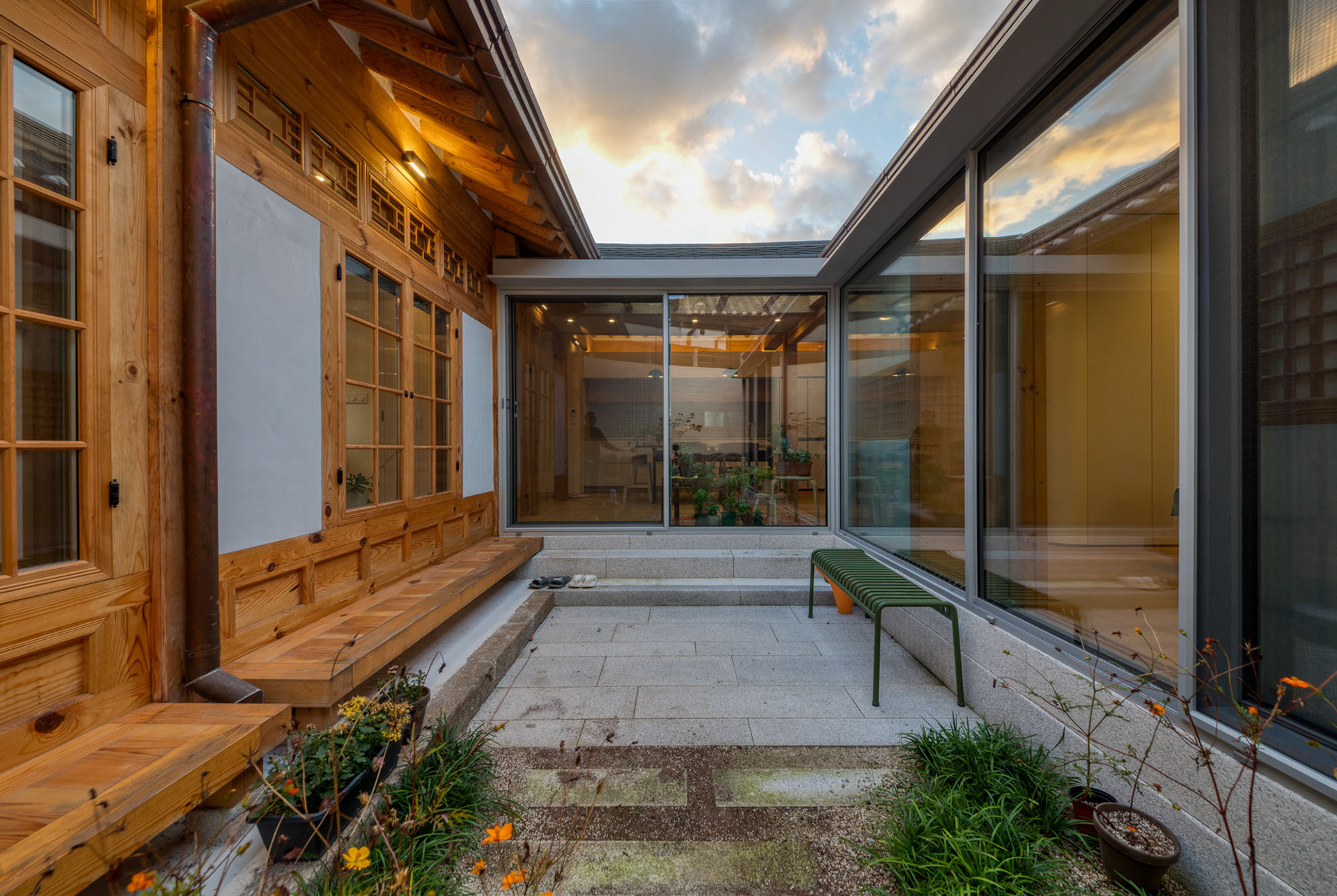 본래 이 한옥은 1920년대 후반 도시개발기에 조성된 전형적인 도시 한옥으로, 약 41평의 협소한 대지에 17평 규모의 'ㄷ'자형 구조를 가지고 있었습니다. 한정된 면적 안에 건축주의 요구 프로그램을 수용하기 위해, 내부 공간의 수평적 확장과 개방감 확보를 주요 설계 전략으로 삼았습니다. 대청 영역을 안마당 쪽으로 확장해 평면적 여유를 확보하는 동시에, 마당의 공간감이 축소되는 것을 보완하기 위해 증축부에 유리 천창과 전면 창호를 계획했습니다. 이를 통해 실내에서도 마당을 향한 넓은 개방감을 느낄 수 있도록 했습니다.